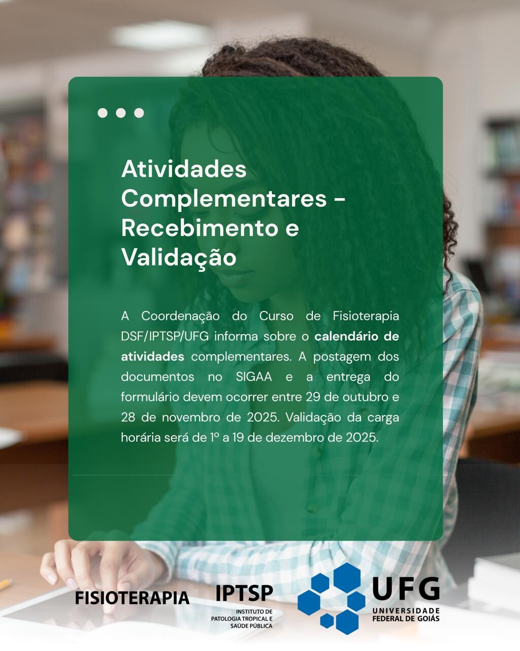 A Coordenação do Curso de Fisioterapia da UFG/IPTSP informa o calendário para recebimento e validação das atividades complementares referentes ao semestre vigente: